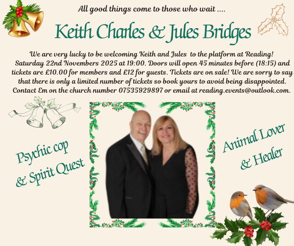 £8 for members and £10 for guests. Keith Charles ‘The Psychic Cop’ and Jules. The evening will consist of Keith and Jules demonstrating their mediumship and there will also be a special raffle (£1 for 5 tickets).